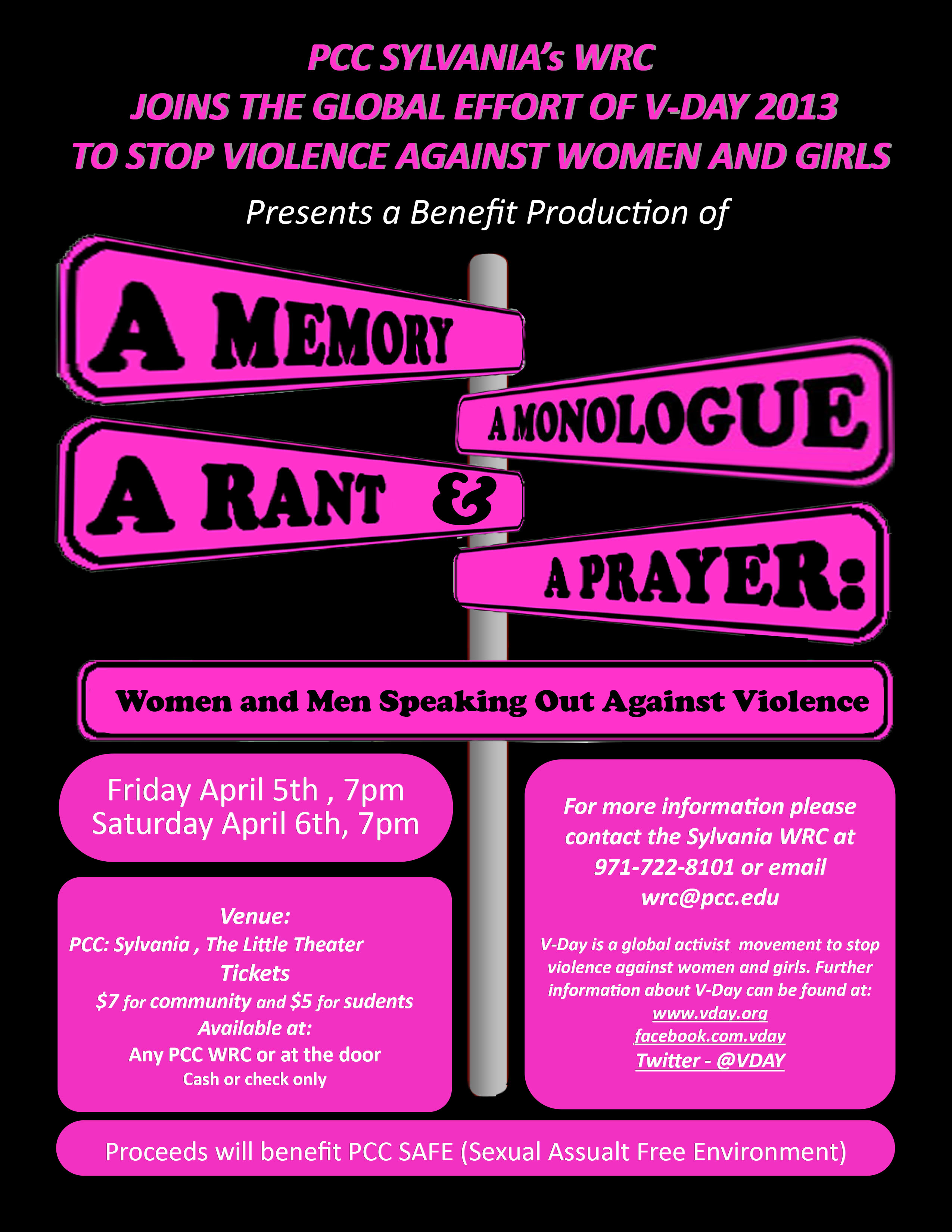 The Sylvania Women’s Resource Center has produced “The Vagina Monologues,” for more than 13 years as part of the global V-Day campaign to end violence against women and girls. This year, the WRC is premiering the new Eve Ensler play, “A Memory, A Monologue, A Rant, & A Prayer.” The play is part of the continued effort to create awareness about men’s role in the efforts to end violence. This new production includes first person accounts from men and women and several men in the PCC community are part of the play.
