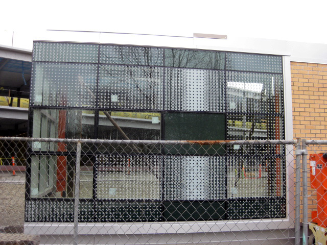 This mock up also includes a section of the glass feature wall with a basket-weave pattern of applied graphics (called a frit pattern) and glass units where paint has been applied to the back surface of the unit (called a spandrel panel). All of these elements will be part of the new Building 7 addition.