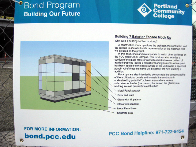 Earlier this year, Fortis Construction, with help from PCC students, built a construction mock up of Building 7 to provide the architect (OPSIS architecture), the contractor and the college to see a full-scale representation of the materials that will be used on the project. In this case, it was the brick and metal panels intended to match the other buildings on the Rock Creek campus.