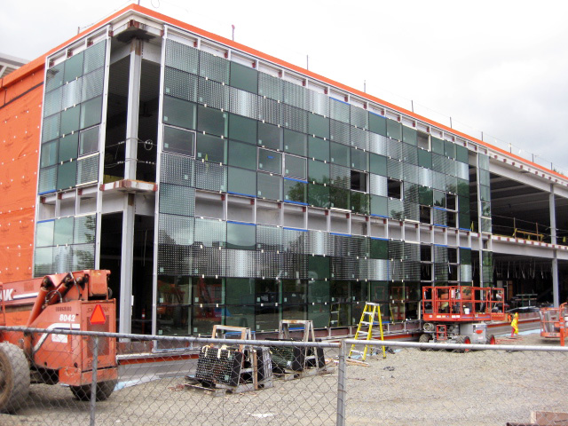 Fortis Construction continues work on the new glass facade of Building 7 at Rock Creek Campus. The photo, taken May 22, 2013, shows that crews have completed the majority of the glass installation work.