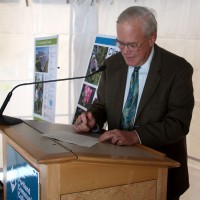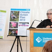 Under a tent shielding the audience from rain and wind on Wednesday, May 22 at the Sylvania Campus courtyard, the PCC Sustainability Council celebrated the signing of the 2013 Climate Action Plan, a second edition of the original plan signed by College President Preston Pulliams in 2009. Many of the goals are to get the college below greenhouse gas levels measured during a 2006 inventory. So by 2030, PCC is targeting to be 40 percent below 2006 greenhouse gas levels and 80 percent below the levels by 2050. On hand for the ceremony was Randy McEwen (college vice president), Linda Gerber (Sylvania president) and Erin Stanforth, to name a few. McEwen ultimately signed the revised plan to a big applause by the gathered crowd. For the complete plan, visit the PCC Sustainability Webpage or contact Erin Stanforth (sustainability manager) at (971) 722-7635.