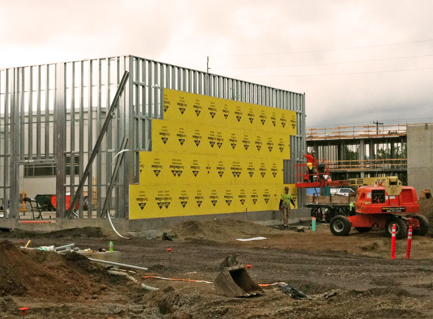 Construction crews are installing the “skin” – exterior yellow shear board – on the addition to Southeast’s expanded kitchen and servery.