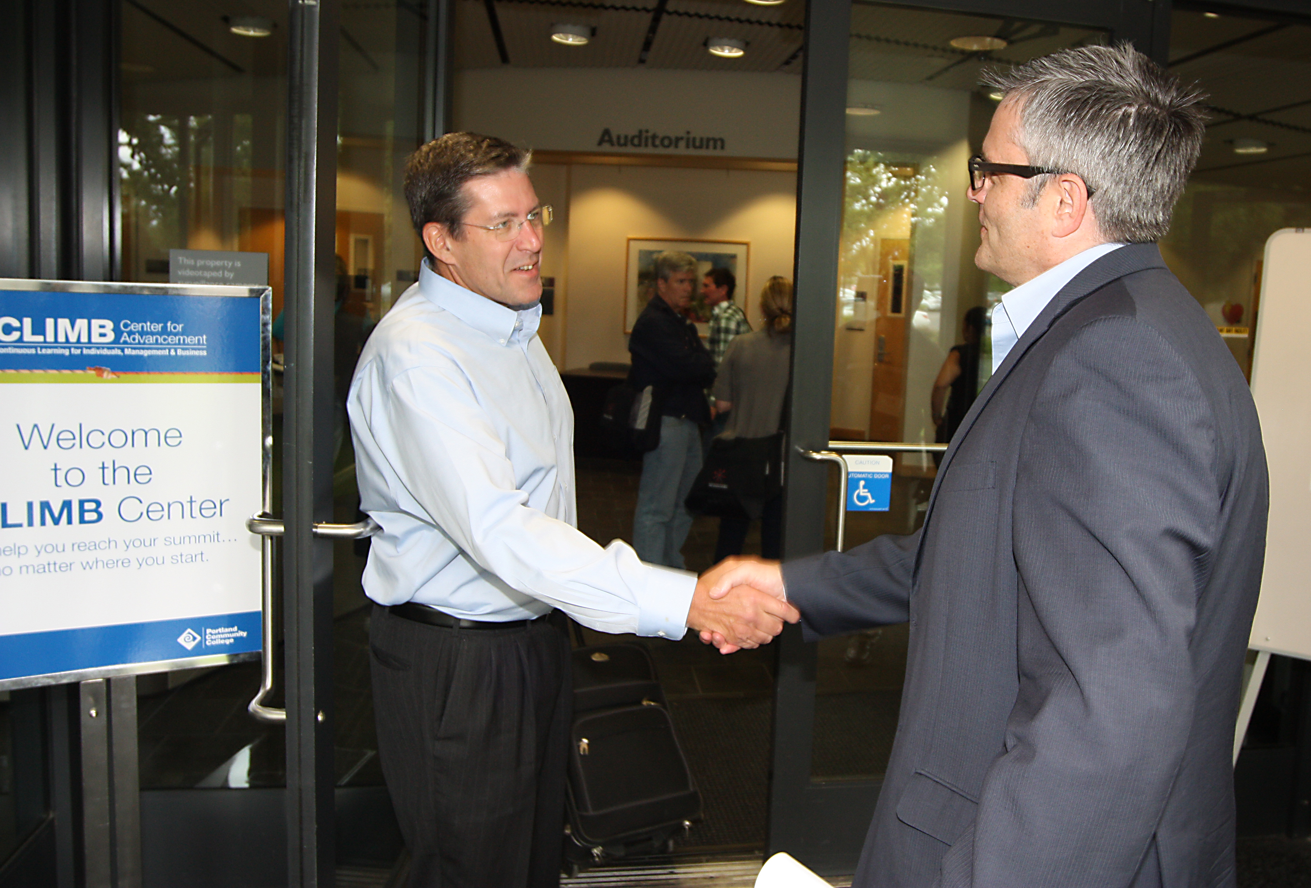 The CLIMB Center and representatives from PCC’s Small Business Development Center hosted a 23-person contingent from Fresno, Calif., to discuss lessons learned serving Portland-area minority-owned small businesses. Former Portland Mayor Sam Adams, now executive director of the City Club of Portland, led the group from downtown Portland to CLIMB Center via the Street Car and sat in on a 60-minute representation by Bob Hanks (CLIMB director) and Tammy Marquez-Oldham (PCC’s SBDC director) discussing the successes and barriers for minority small business. Topics included certifications offered by Oregon’s Office of Minority, Women and Emerging Small Business (it has more than 3,300 certified businesses), barriers and advantages to ownership, success stories, technical assistance that is available to them and Oregon Department of Transportation funding grants.