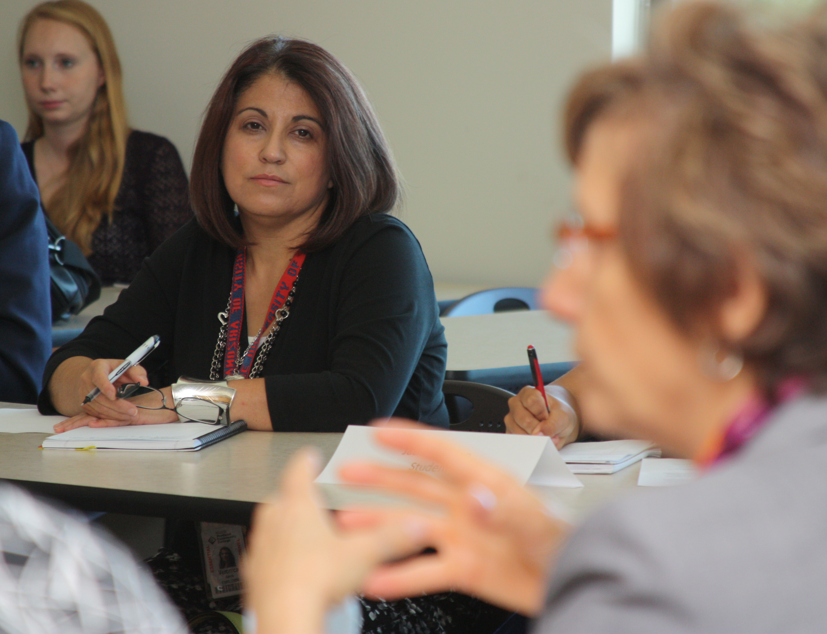 Veronica Garcia, PCC's dean of Student Affairs, listens to Bonamici discuss unpaid internships.