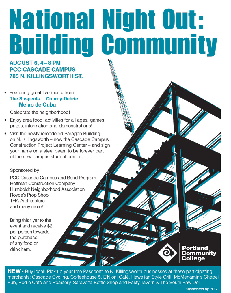 A neighborhood tradition returns with a new twist when Portland Community College’s Cascade Campus and the Humboldt Neighborhood Association host their annual National Night Out celebration on Tuesday, Aug. 6. This year – in addition to local food carts, live music, family games, dancing, and all-around good times – attendees will be able to sign their names to a steel beam that will be a permanent part of the campus’ new Student Center building, currently under construction.ca_nightout_flyer