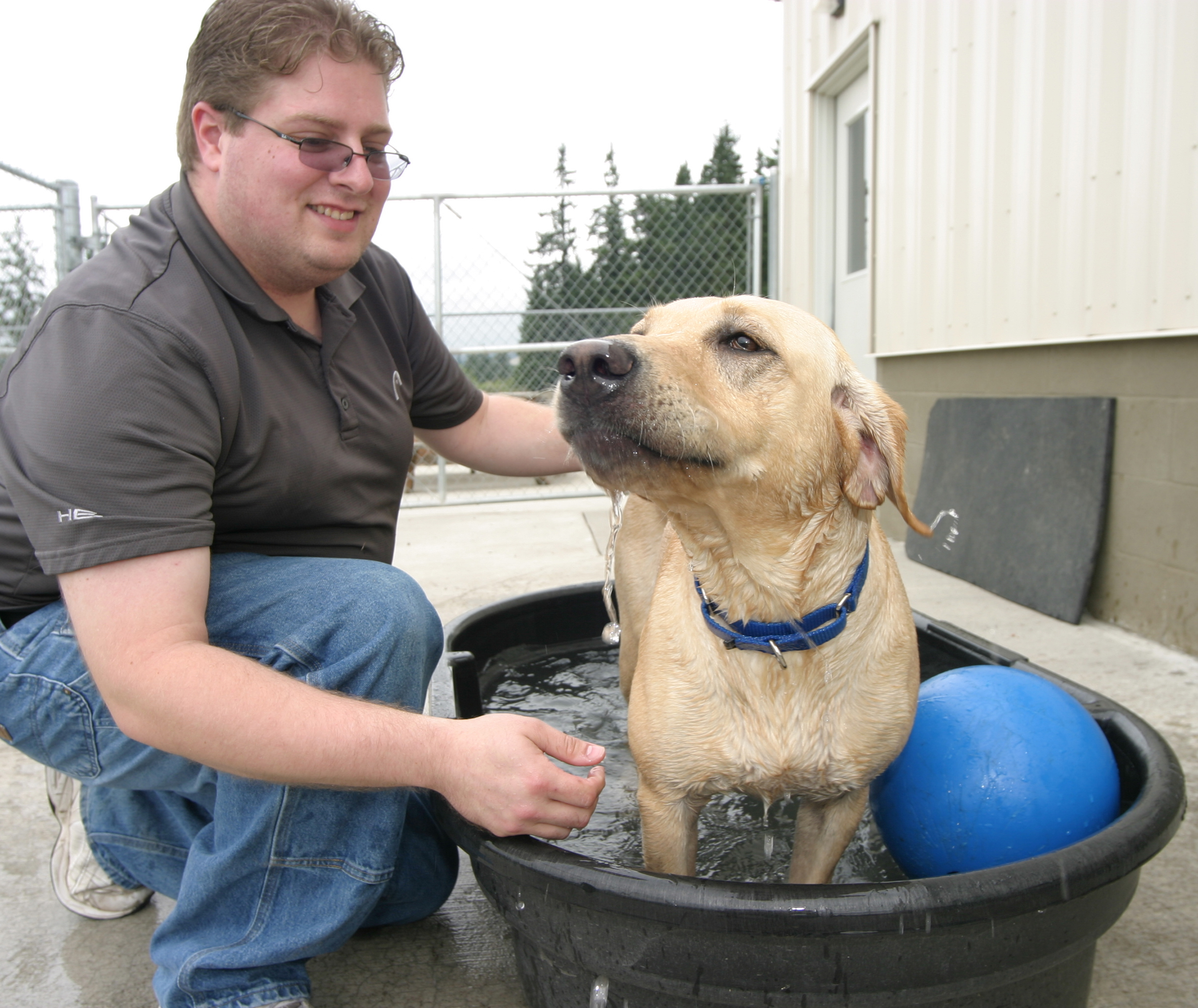 Karma the Dog, a yellow labrador retriever, gets a bath from student Chris Green at PCC’s Veterinary Technology Program’s kennel, based at the Rock Creek Campus.