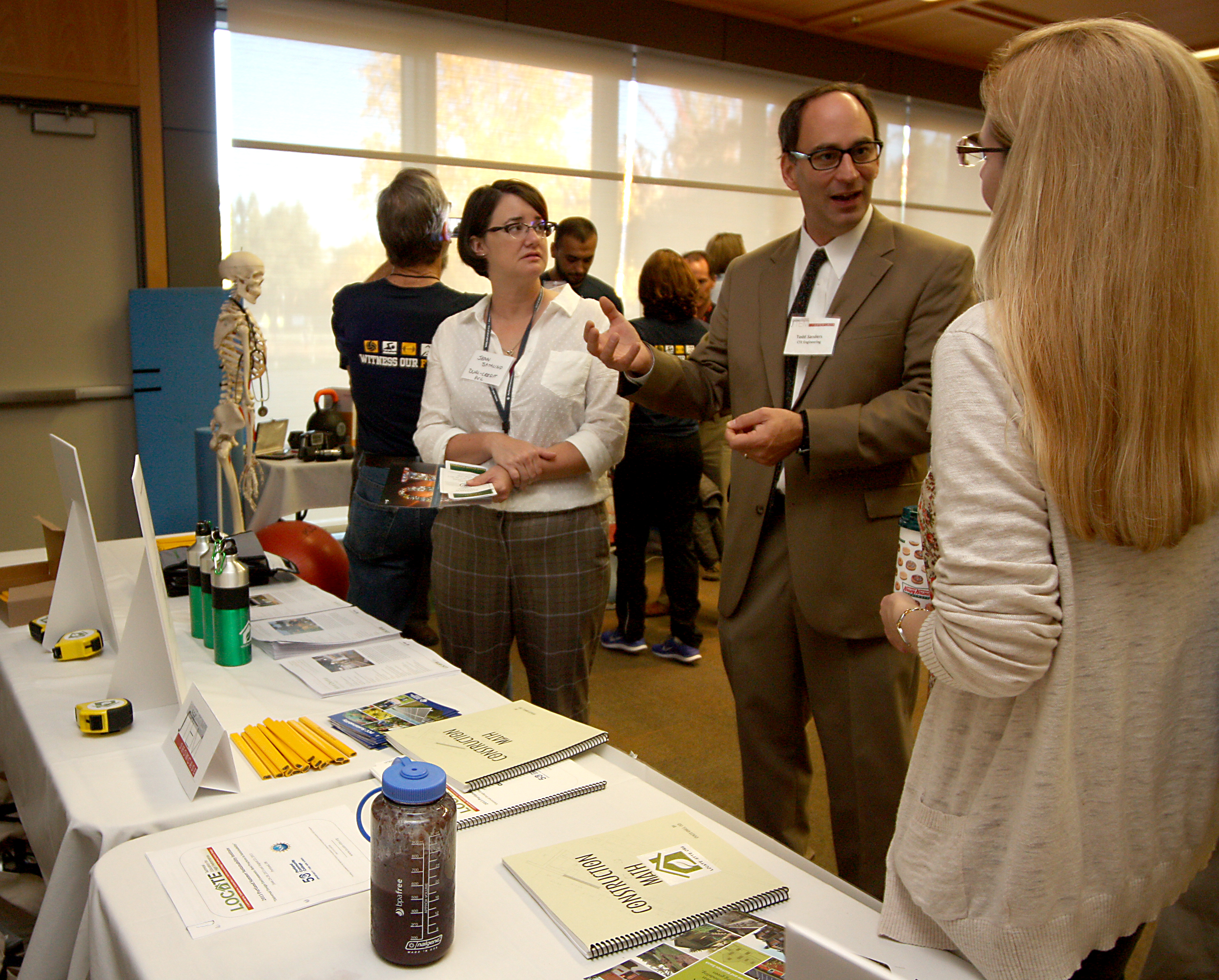 Todd Sanders, mechanical engineering faculty, chats with other faculty about his display.