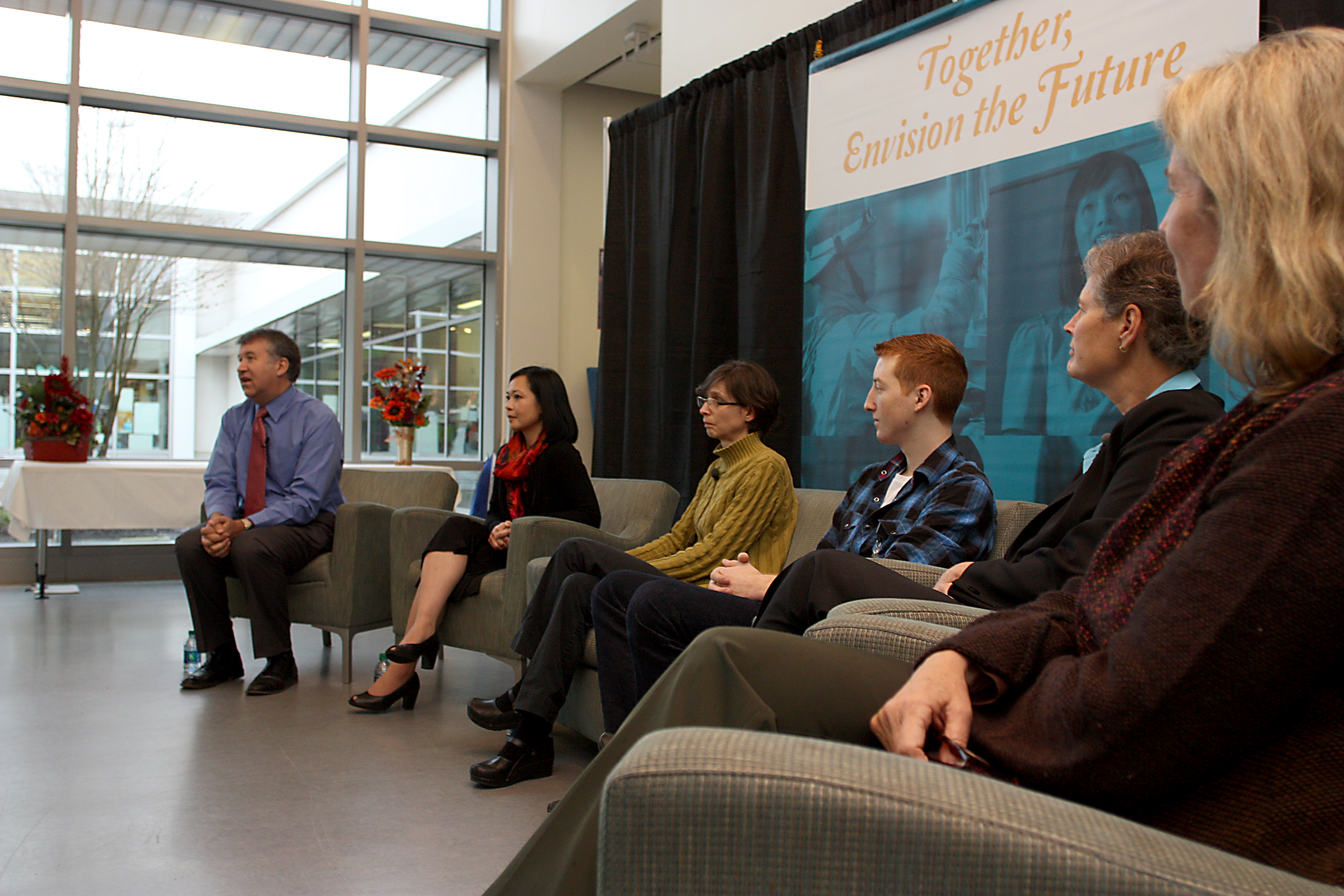Southeast Center student leader Patrick Stupfel chats with the standing room only crowd in the Great Hall.