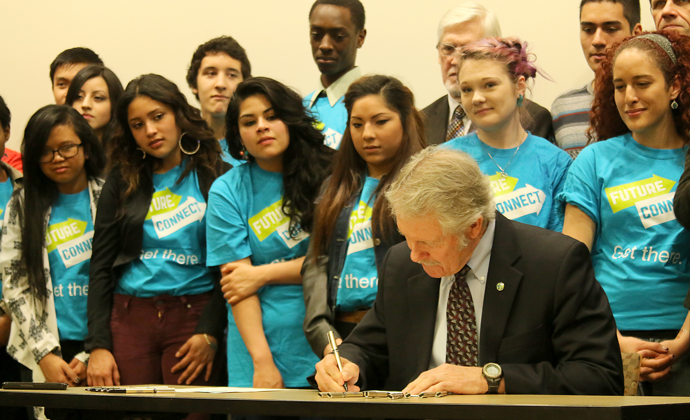 Dozens of students in the PCC Foundation’s Future Connect Program gathered around the Governor to watch him sign the bills in front of gathered media and legislators.