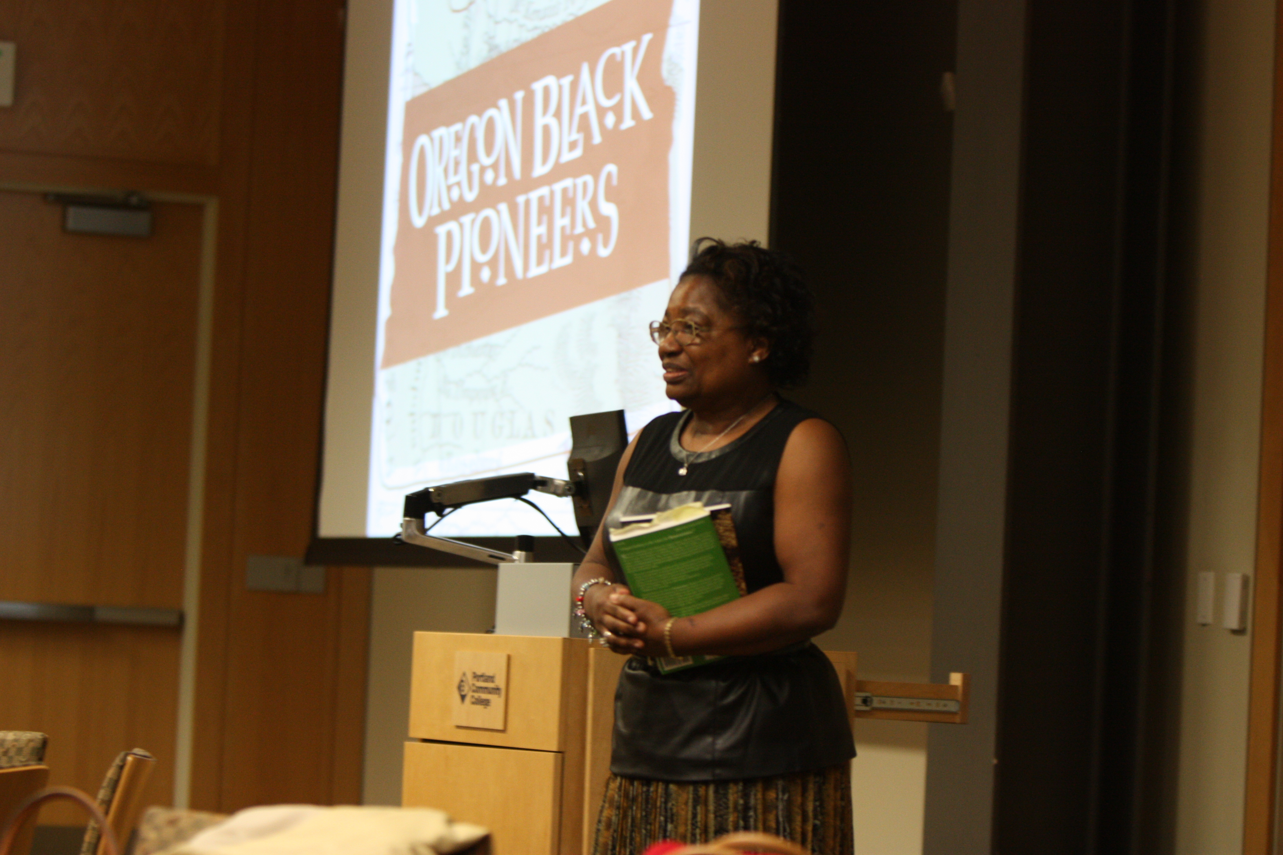 Speaking at Rock Creek Campus’ Building 9 Event Center, Richardson highlighted her organization’s effort to tell the stories and history of the first black pioneers. Established in 1993, Oregon Northwest Black Pioneers has devoted itself to education and research on this subject. It was instrumental in uncovering 40 unmarked graves in Salem of blacks from the pioneer era in 2007. Since that discovery, Richardson has been researching black pioneers from all over Oregon. As a result, her organization has published the books “African Americans in Portland,” and “Perseverance.”