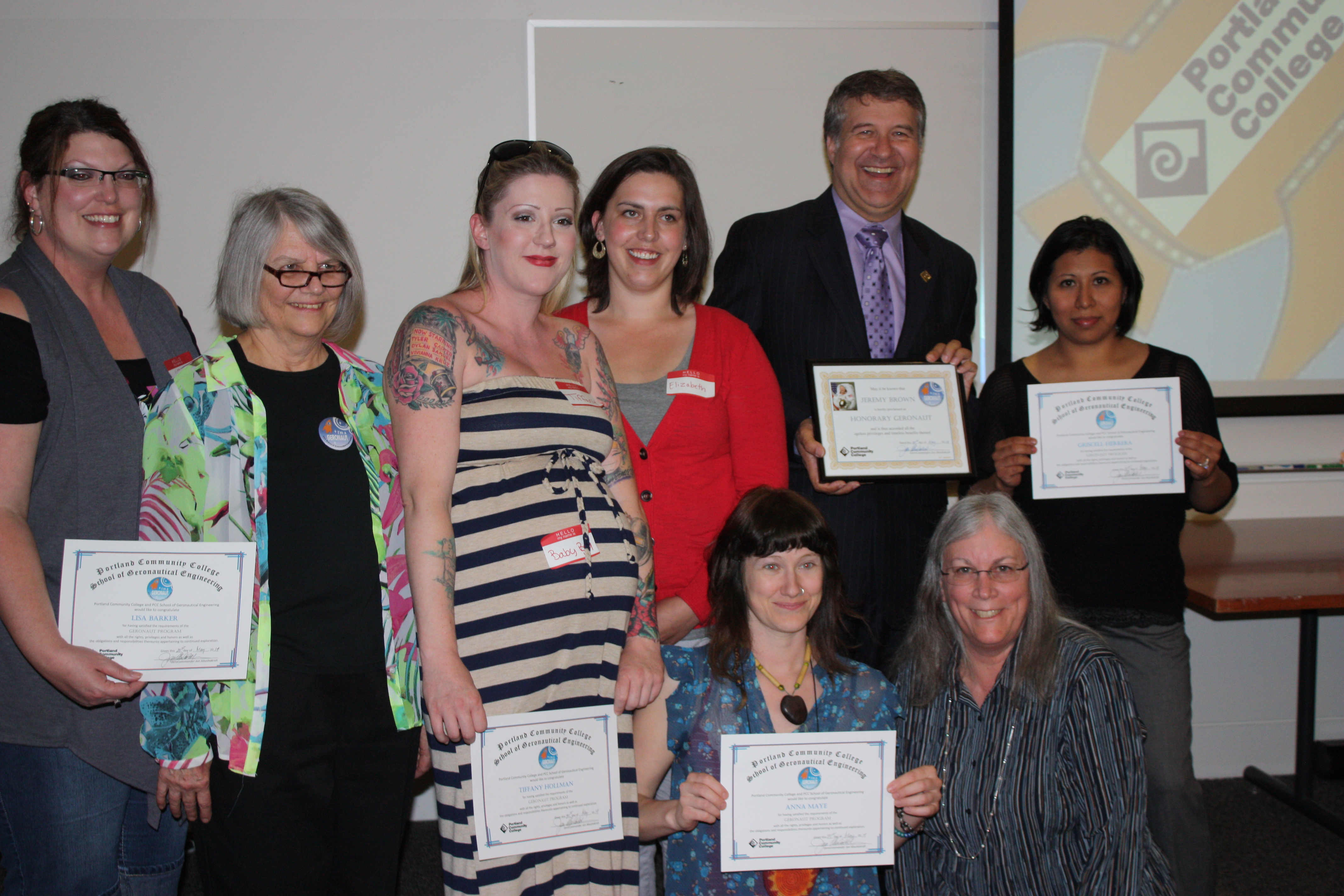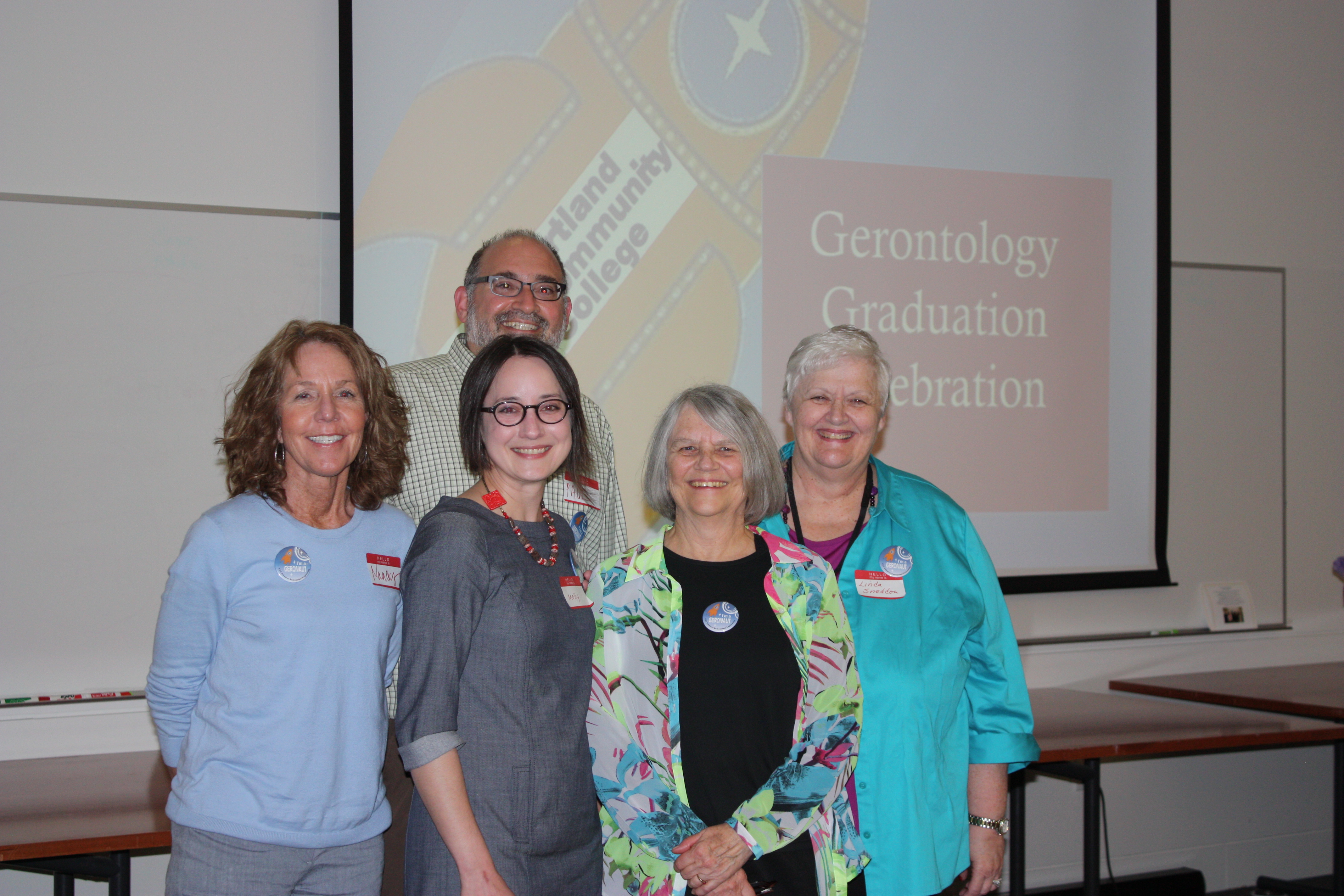 Portland Community College President Jeremy Brown stopped by the event to wish the graduates well – which gave Gerontology Program Director Jan Abushakrah the opportunity to present him with his “Honorary Geronaut” award.