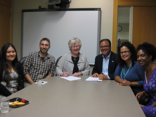 Signing the Memorandum of Understand are (left) Johanna Flores, Dreamer and PCC student; Kyle Pratuch, college resource coordinator for the Foundation; Sandra Fowler-Hill, president of the Rock Creek Campus; Mark Langseth, president & CEO of I Have A Dream Foundation; Brenda Ivelisse, associate dean of students at Rock Creek, and Traci Rossi, vice president for programs at the Foundation.