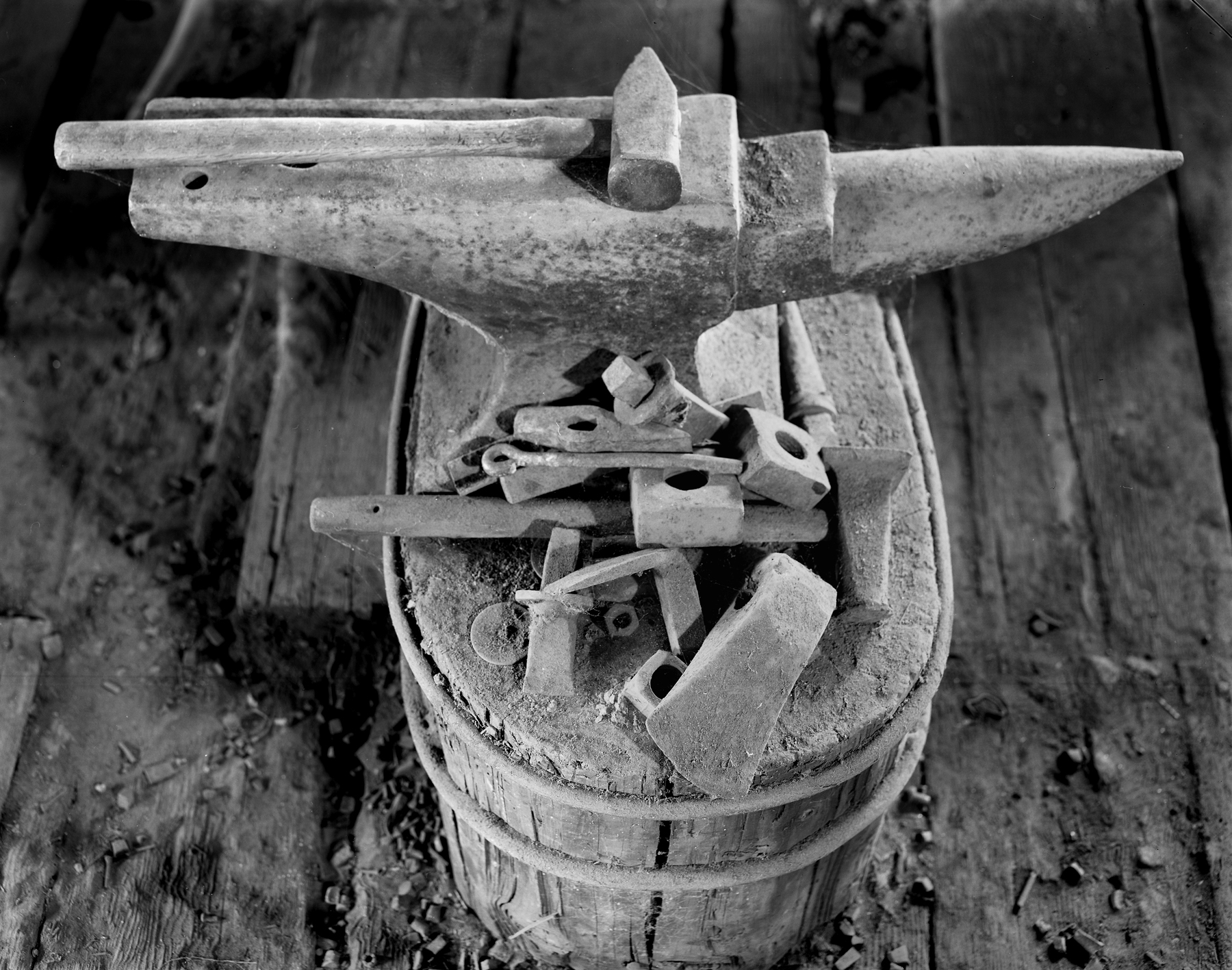‘Anvil and Hammer’ from Loren Nelon’s exhibit ‘Portal to the Past,’ featuring black and white photographs of a preserved blacksmith’s shop from the 1960s.