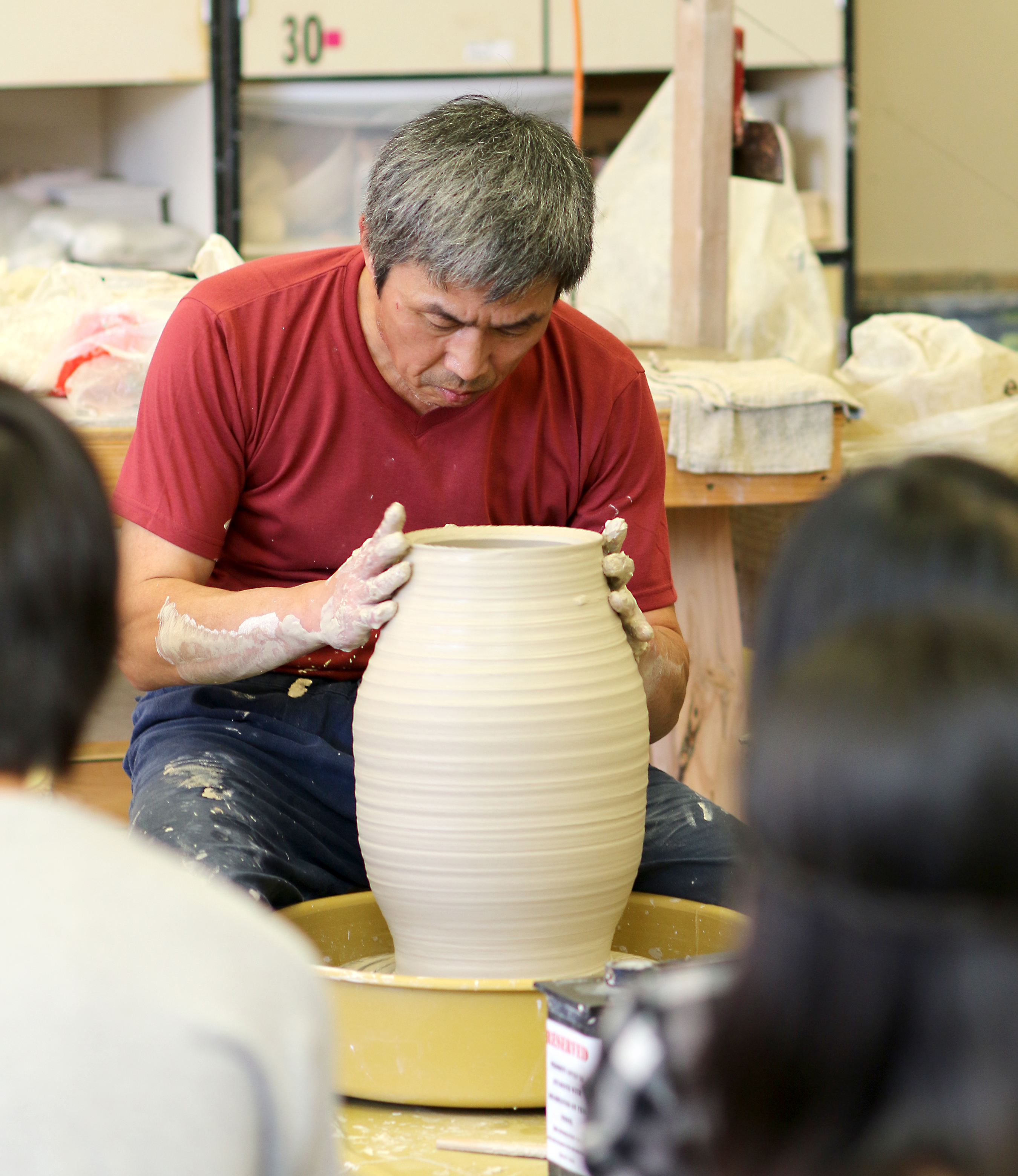 Master potter Kazunao Azuma works the wheel-thrower for the gathered students.