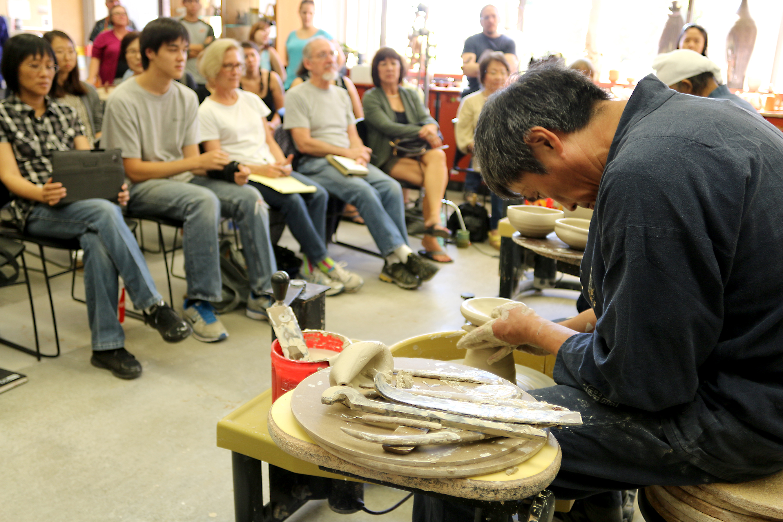 Master potter Kazunao Azuma works the wheel-thrower for the gathered students.