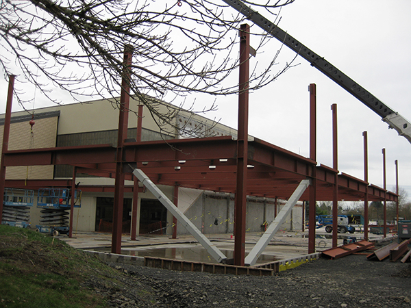 As part of the bond work approved by voters in 2008, structural steel framing has been erected on the concrete slab poured last fall. The 63,000 square-foot addition will wrap around Building 5’s gymnasium, which remained in use during the demolition of the adjacent structure last summer.