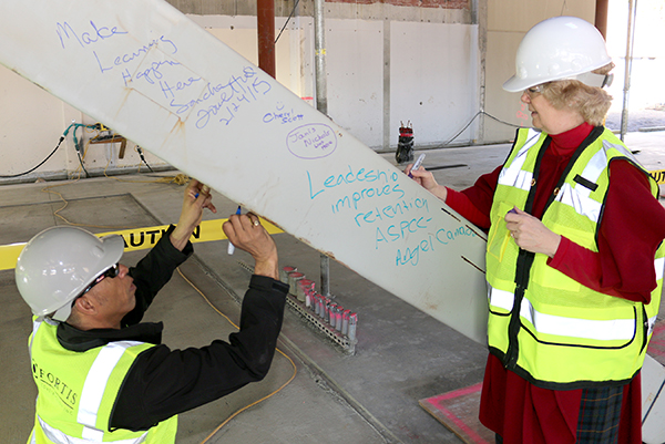 The beam designated for signing is a buckling-restrained brace, which is specifically designed to stabilize a structure during a seismic event. Building 5’s construction phase is on track for completion in December 2015, and the building will be ready for occupancy in spring 2016. With all the steel framing now in place, Fowler-Hill said the campus community can see that “we’re on the down slope.”