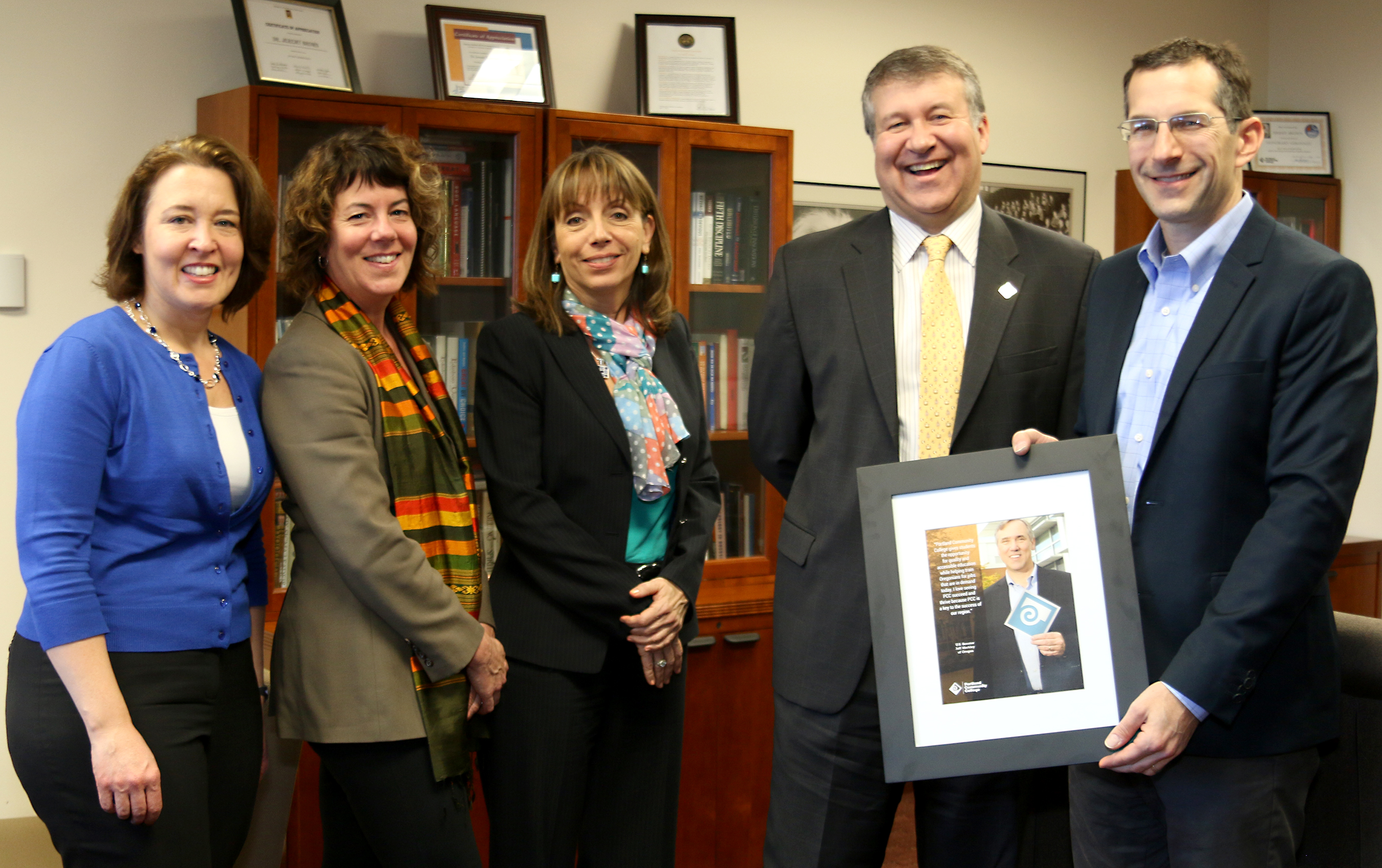 PCC President Jeremy Brown presents U.S. Sen. Jeff Merkley's Chief of Staff, Mike Zamore (far right), and his Education Policy Legislative Assistant, Susan Lexer (far left), a framed feature article honoring Sen. Merkley. Also on hand were, left to right, Traci Fordham (chief of staff) and Sylvia Kelley (vice president).