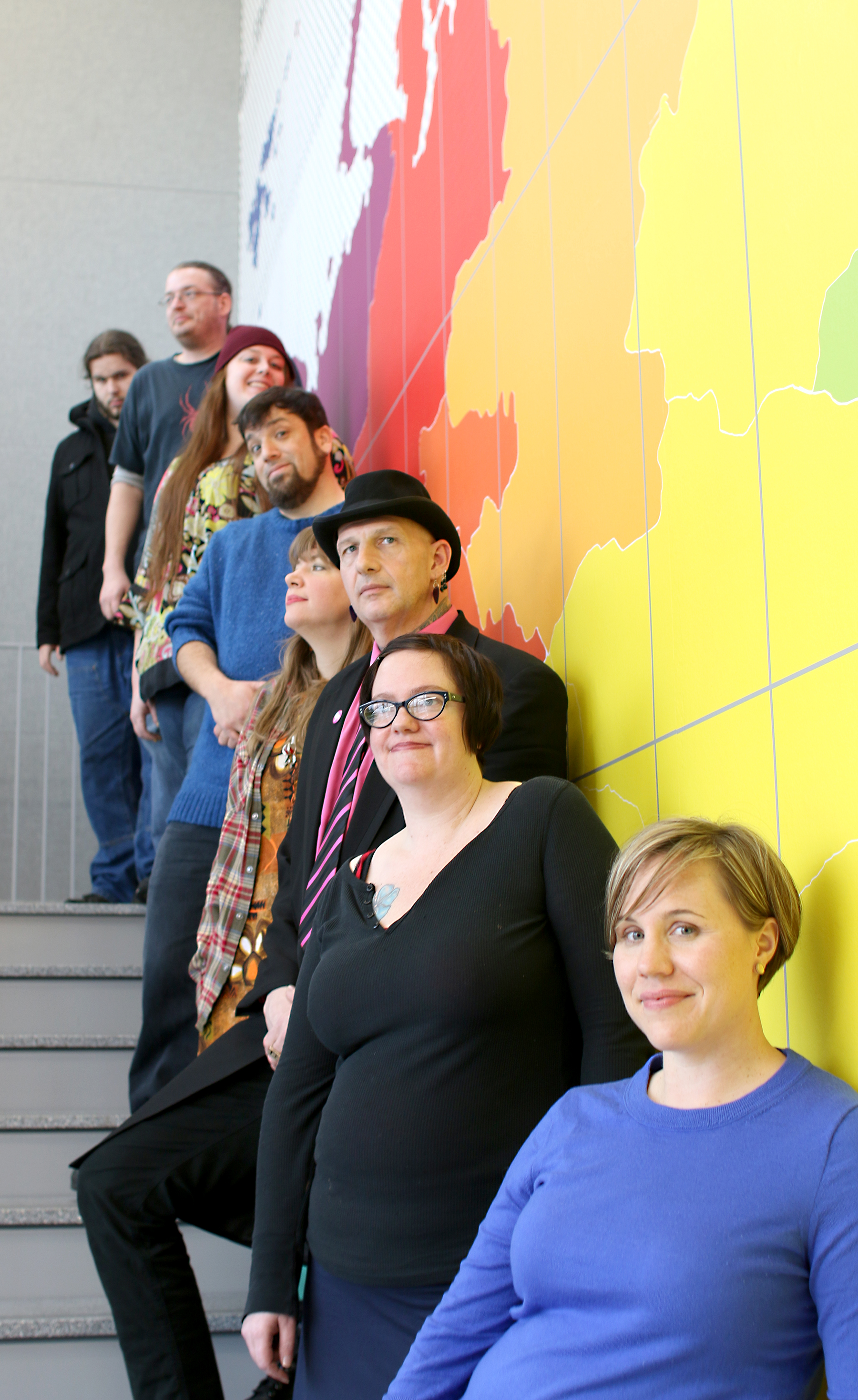 The Writing Program, thanks to the recent expansion of the campus, has a lot more classroom and study space to utilize as it expands the number of classes offered. Here, students in the program along with Jessica Johnson (far right) and Blake Hausman (fourth from left) hang out in the new Library.