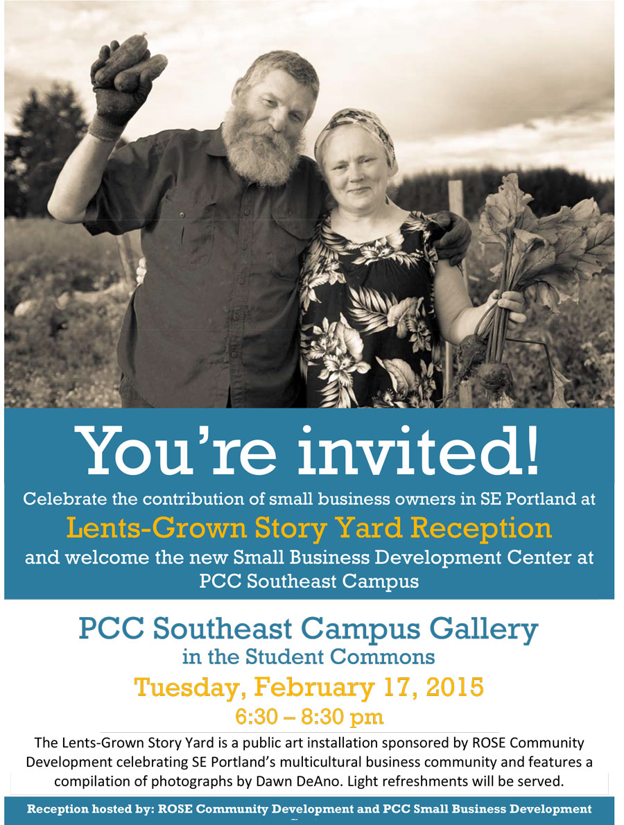 The Southeast Campus, PCC’s Small Business Development Center and the ROSE Community Development are hosting the “Lents Grown – Story Yard” photography exhibit and opening reception in the Student Commons this month. The public is invited to the gallery reception at 6:30 p.m., Tuesday, Feb. 17. Light refreshments will be served.