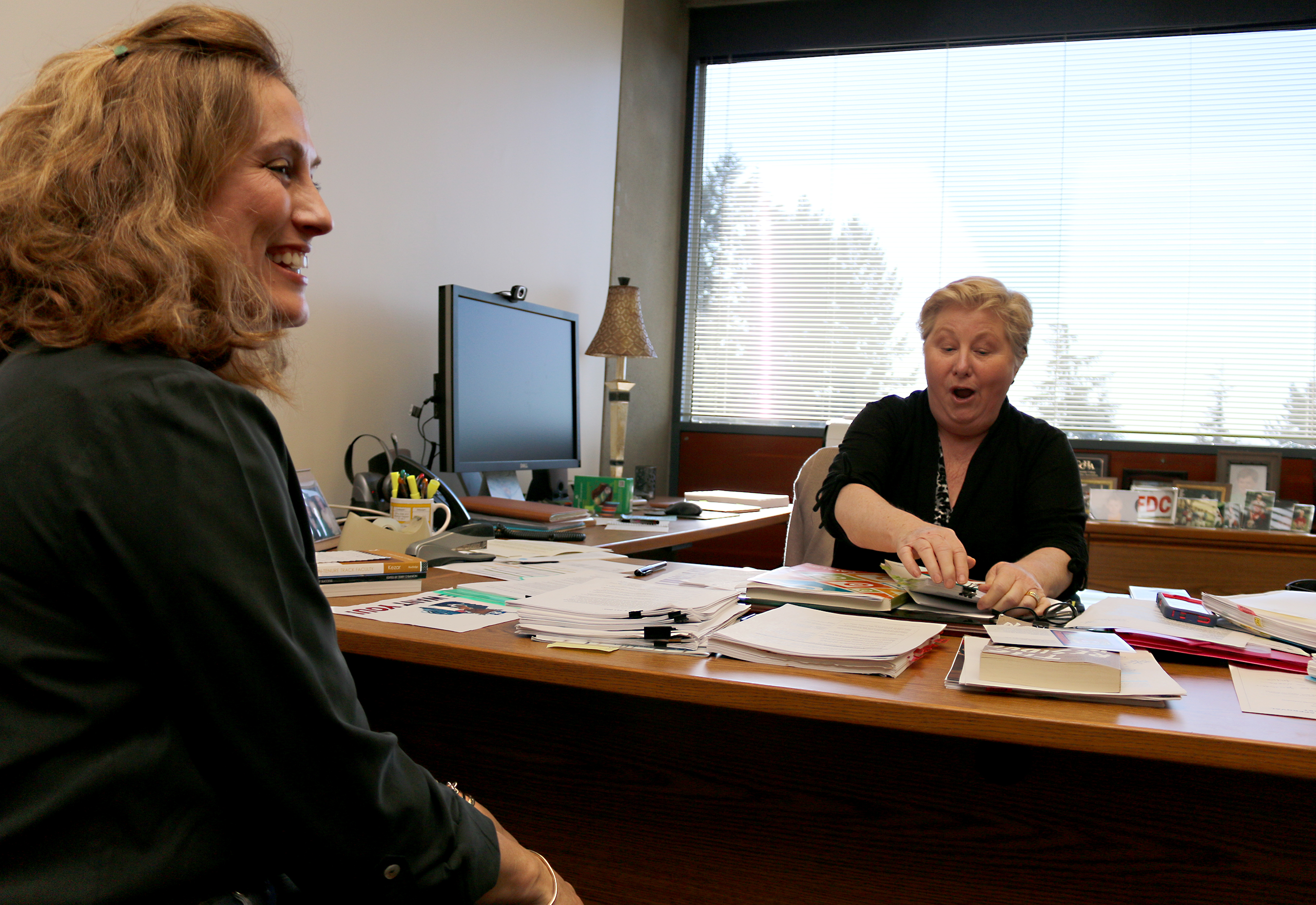 Chris Chairsell (right), vice president of academic & student affairs, shares a light moment with Kate Chester, PCC's Public Relations manager, as they discuss the college's accreditation report.