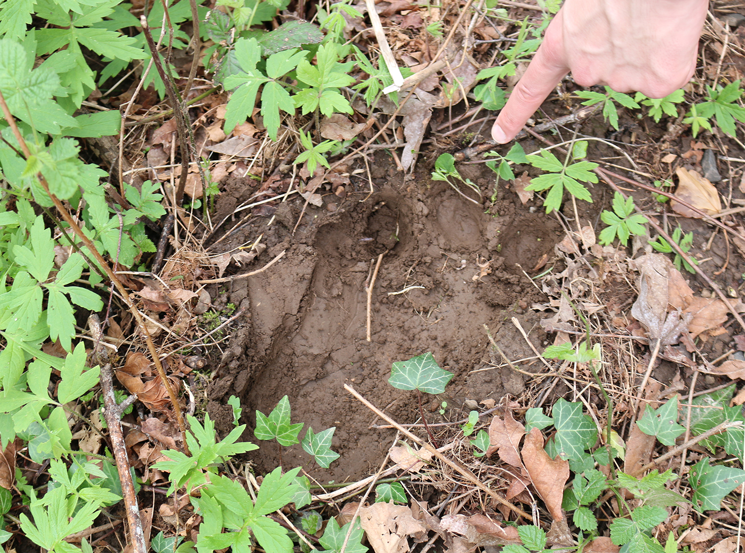 Proof! A Monster Spotters Student Club photograph of one of the many strange tracks they found among invasive ivy in Lesser Park. Tracks lead to a trap students made that is baited with M&Ms. They report no beast has been captured yet, though.