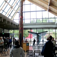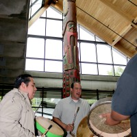 PCC’s Sylvania Campus unveiled the new home for its “Welcoming Pole” and new east entry to the College Center on Tuesday, May 12. The event also celebrated the capital bond improvements on the campus through the years. There was drumming by Dustin Harmon and The Woodsmen from The Confederated Tribes of Grand Ronde. There were speeches by interim Sylvania Campus President Suzanne Johnson, Bond Program Director Linda Degman and Sylvania Multicultural Center student leader Rebecca Uh.