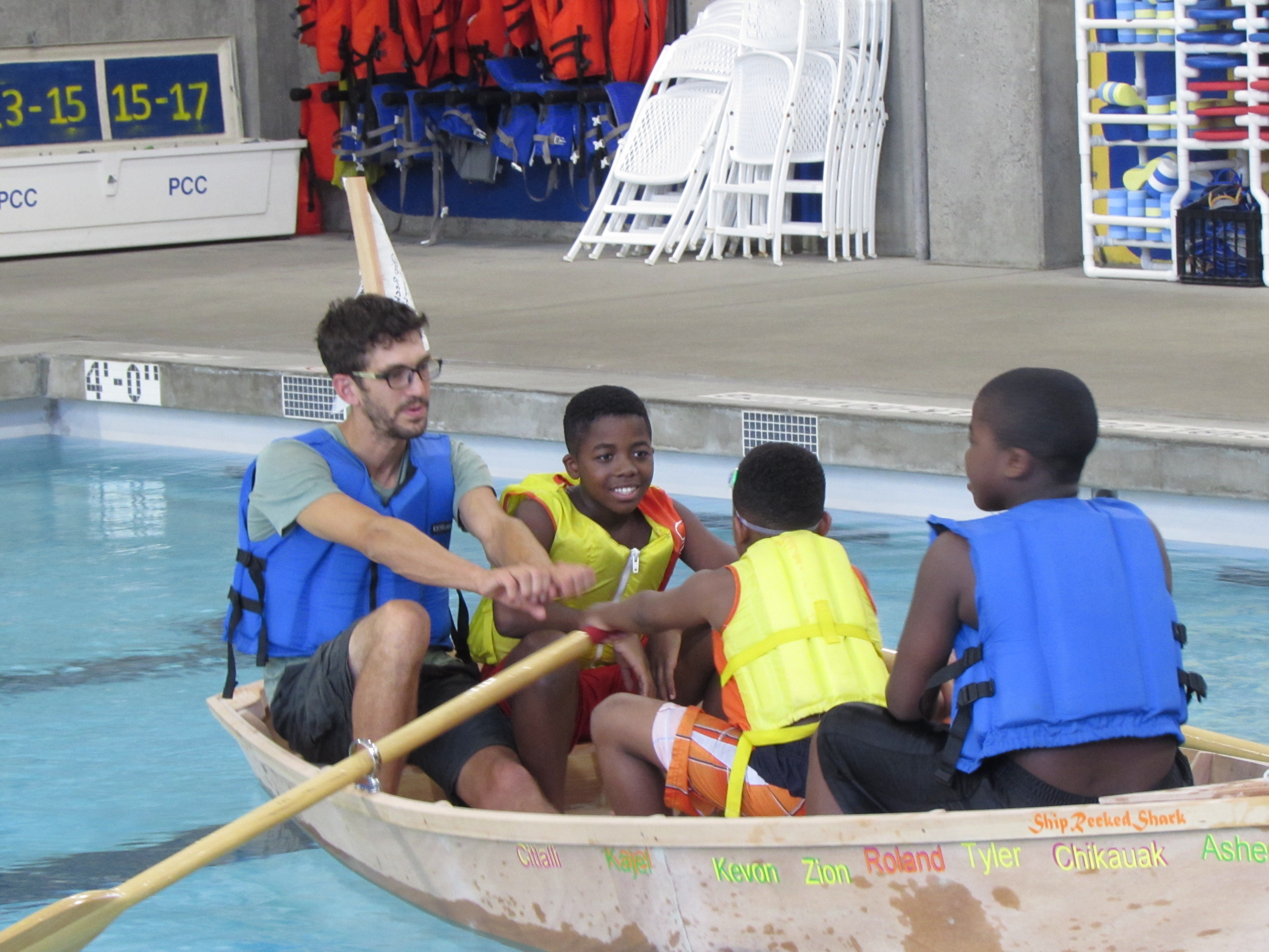 Christening the the boat “Ship Recked Shark,” eight students (seven boys and a girl) ended a week that combined teamwork and communication with traditional boat building to increase their skills in Science, Technology, Engineering and Math (STEM). The program was a partnership between PCC, the Wind and Oar Boat School and iUrban Teen.