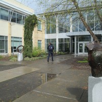 The next step was to move the courtyard’s three bronze sculptures (by Northwest artist Frank Boyden) into temporary storage. The delicate job was done by Cook Brothers Omnia, a Portland firm that has done several art installations for Rock Creek Campus.