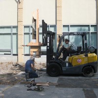 The sculptures were then taken by forklift to their temporary storage area in the outdoor childcare play area between Buildings 2 and 3.