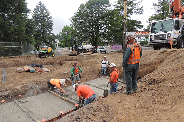 Workers leveled the wet concrete after it was poured in the wooden frames.