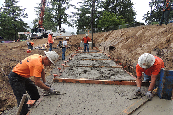 Workers smoothed the freshly poured concrete for the detention pond footings.