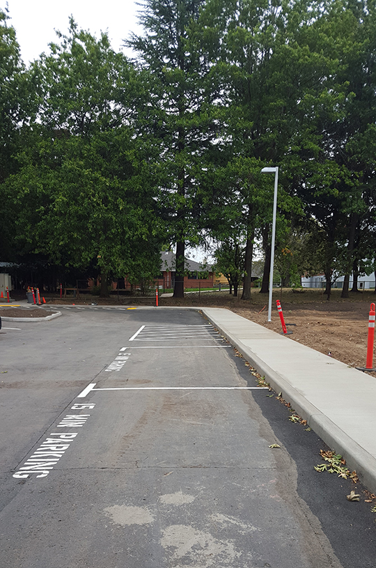 The parking lot was restriped for 48 spaces and improved with better lighting, stormwater drainage and code blue emergency phone. It also has a limited number of short-term spaces for parents who are dropping off or picking up children at the daycare center in nearby Administration Annex.
