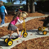 On the building’s west side, numerous windows look out onto an outdoor play area that features several mature trees, a meandering concrete path for scooters and tricycles, a sandbox, planters and covered space.
