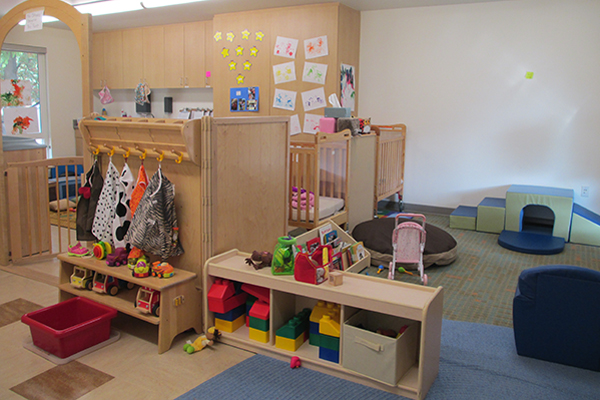 The infant classroom is light and airy, with abundant natural wood.
