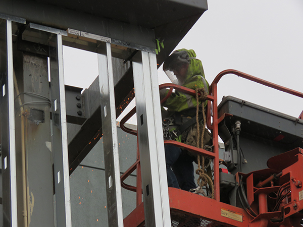 A welder works on the structural steel on the Library's north side.
