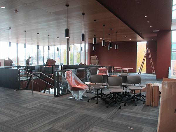 Building 5's interior spaces use plentiful touches of natural wood.