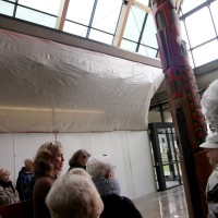 The Sylvania Campus in Southwest Portland welcomed more than 25 guests from the Lake Oswego Reads Program on Tuesday, Feb. 2, to visit the campus’ “Welcoming Pole.” Participants heard the history and symbolism of Native artist Richard Hunt’s 30-foot totem while visiting the College Center, which houses the artwork. The totem pole had spent more than 13 years in the woods above the Performing Arts Center to welcome visitors to Sylvania. Last year, once the new atrium to the CC Building was completed as part of PCC’s bond obligations the totem was moved to the space after it was repainted by Hunt and Visual & Performing Arts Dean Gene Flores and installed as a cornerstone to the renovated space