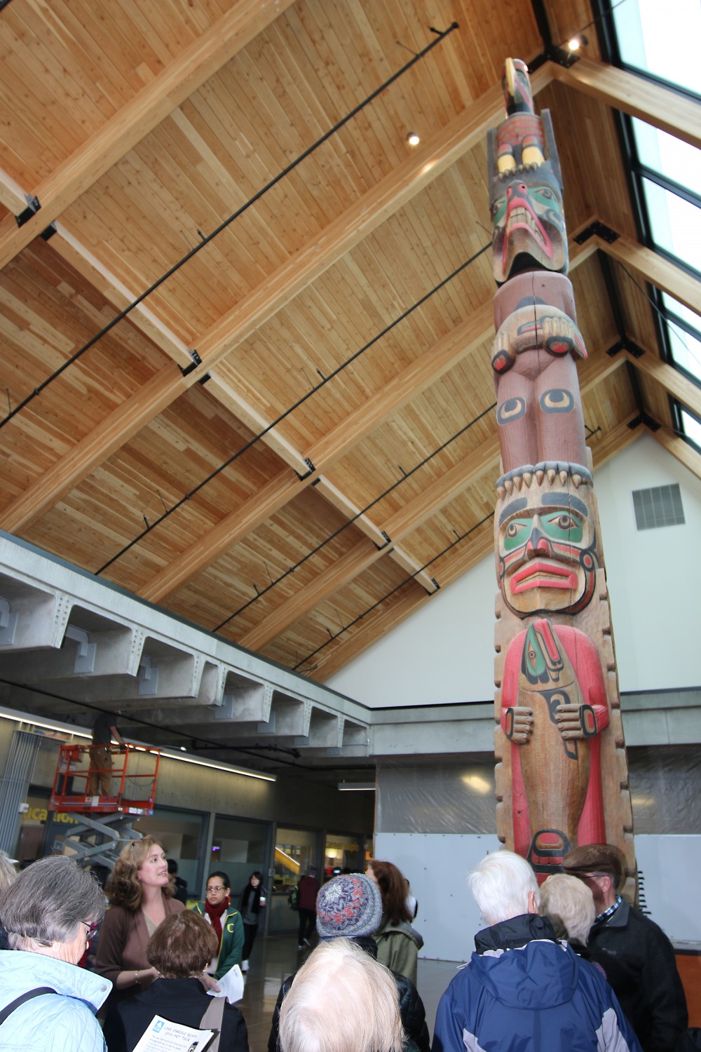 Kate Chester, director of Community Engagement at PCC, welcomes the group of visitors from lake Oswego Read to the Sylvania Campus to view the college's totem pole.
