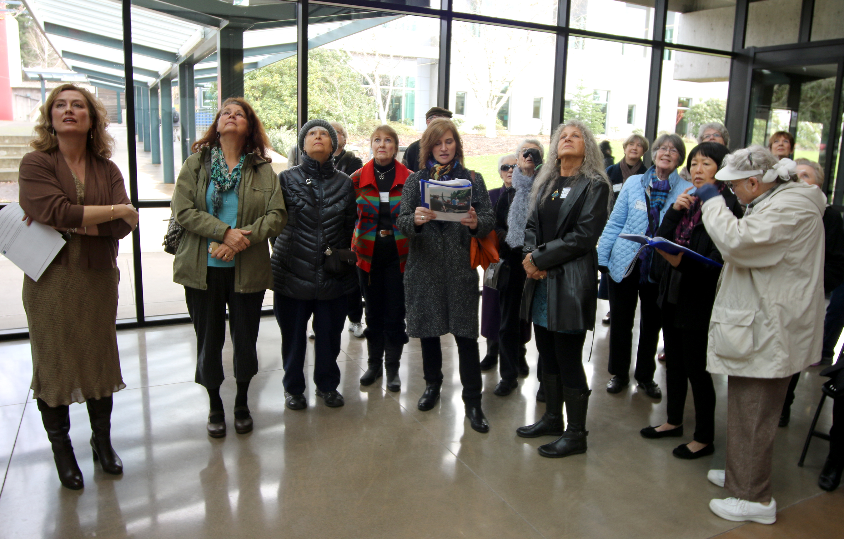 Kate Chester (far left), director of Community Engagement at PCC, welcomes the group of visitors from lake Oswego Read to the Sylvania Campus to view the college's totem pole.