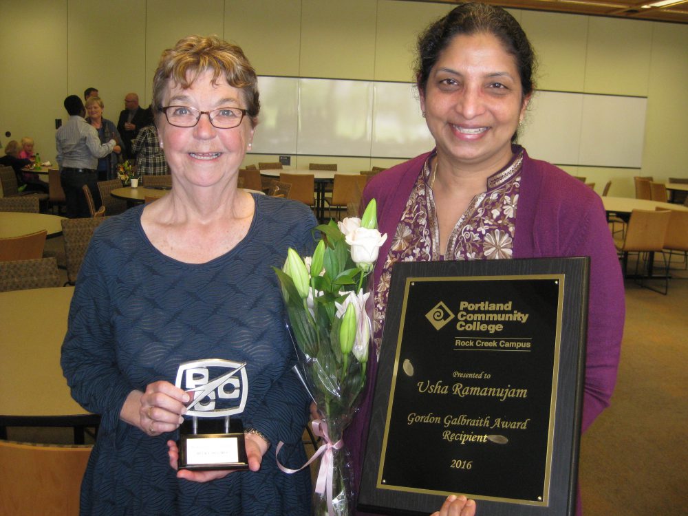 Administrative assistant Becky Hughes received the Bill Christopher Building Community Award, and business administration instructor Usha Ramanujam received the Gordon Galbraith Award for outstanding teaching. The awards were presented during the May 19 Rock Creek Service Awards reception that recognized staff and faculty members for their years of service.
