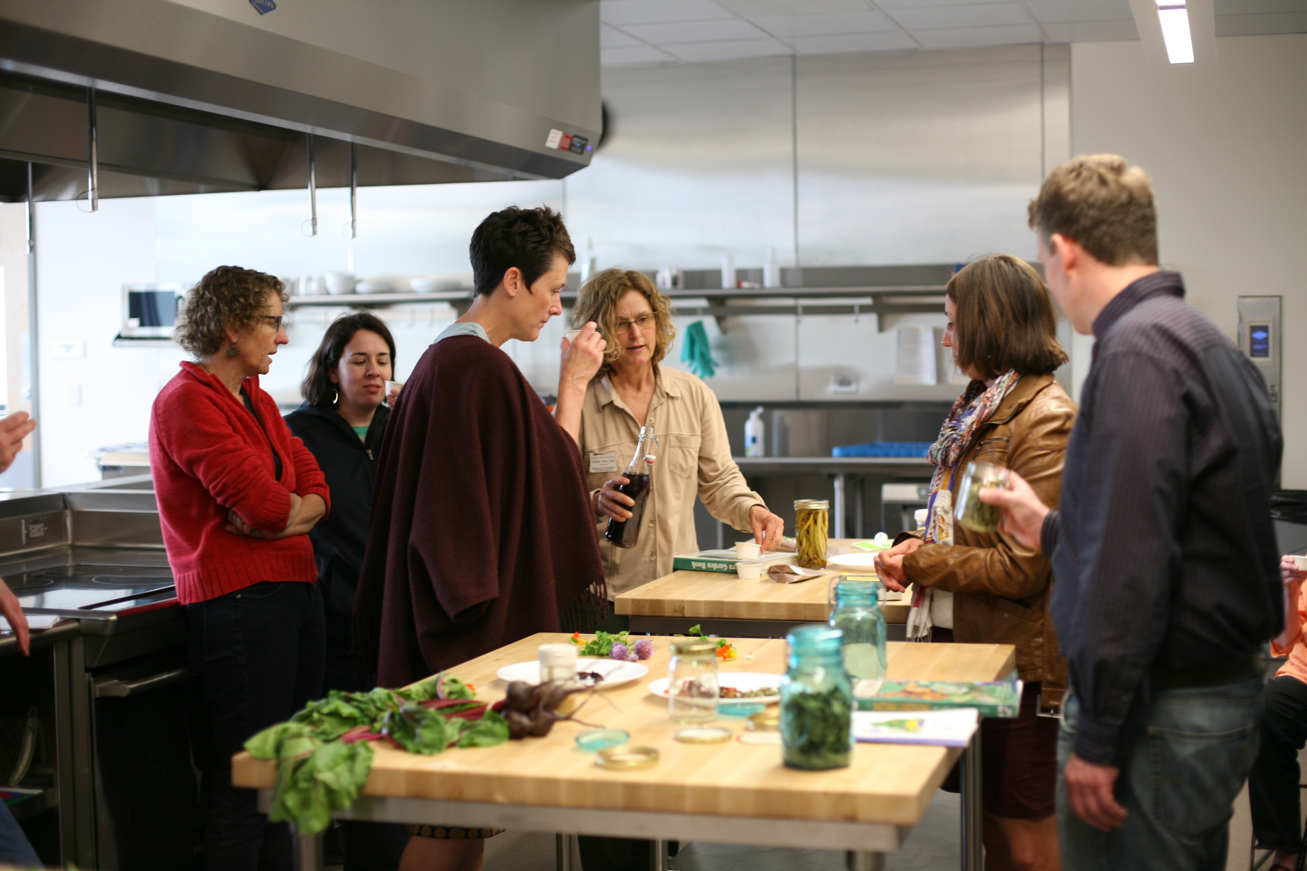Rock Creek staffers sample made vinegar made by Sustainability Coordinator Elaine Cole, who was co-facilitator for the recent workshop "Using Unusual Foods in the Kitchen." The workshop was held in the Foods and Nutrition Lab in the new addition of Building 5.