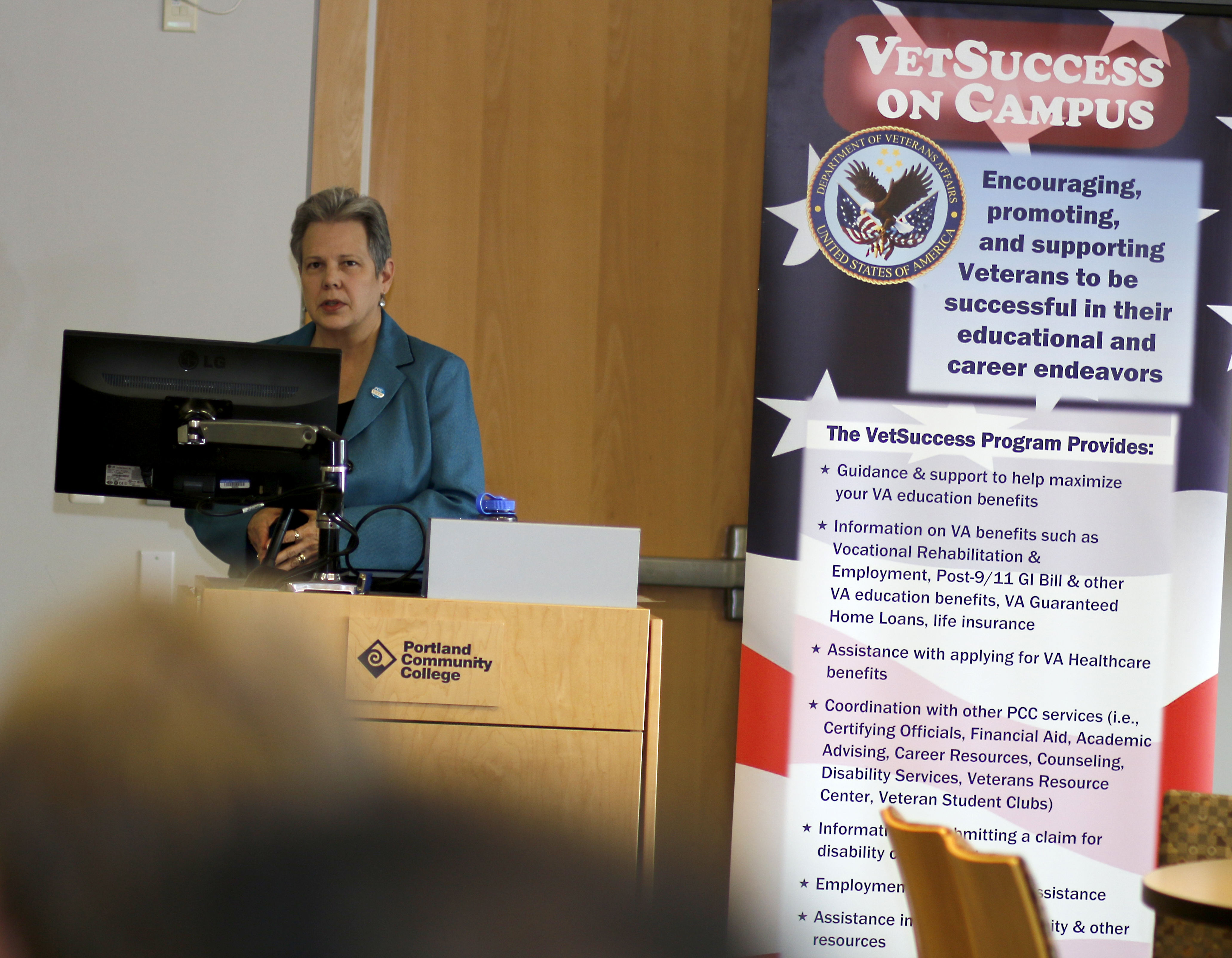 Serving more than 400 veterans students annually, the center was recognized at a recent open house for its efforts in engaging and serving vets through the PCC-VetSuccess partnership. Gathered students enjoyed refreshments and speeches by Regional Benefits Office Assistant Director Carol Roane, Campus President Sandra Fowler-Hill and Rock Creek Dean of Student Development Narce Rodriguez, who founded Rock Creek’s center.