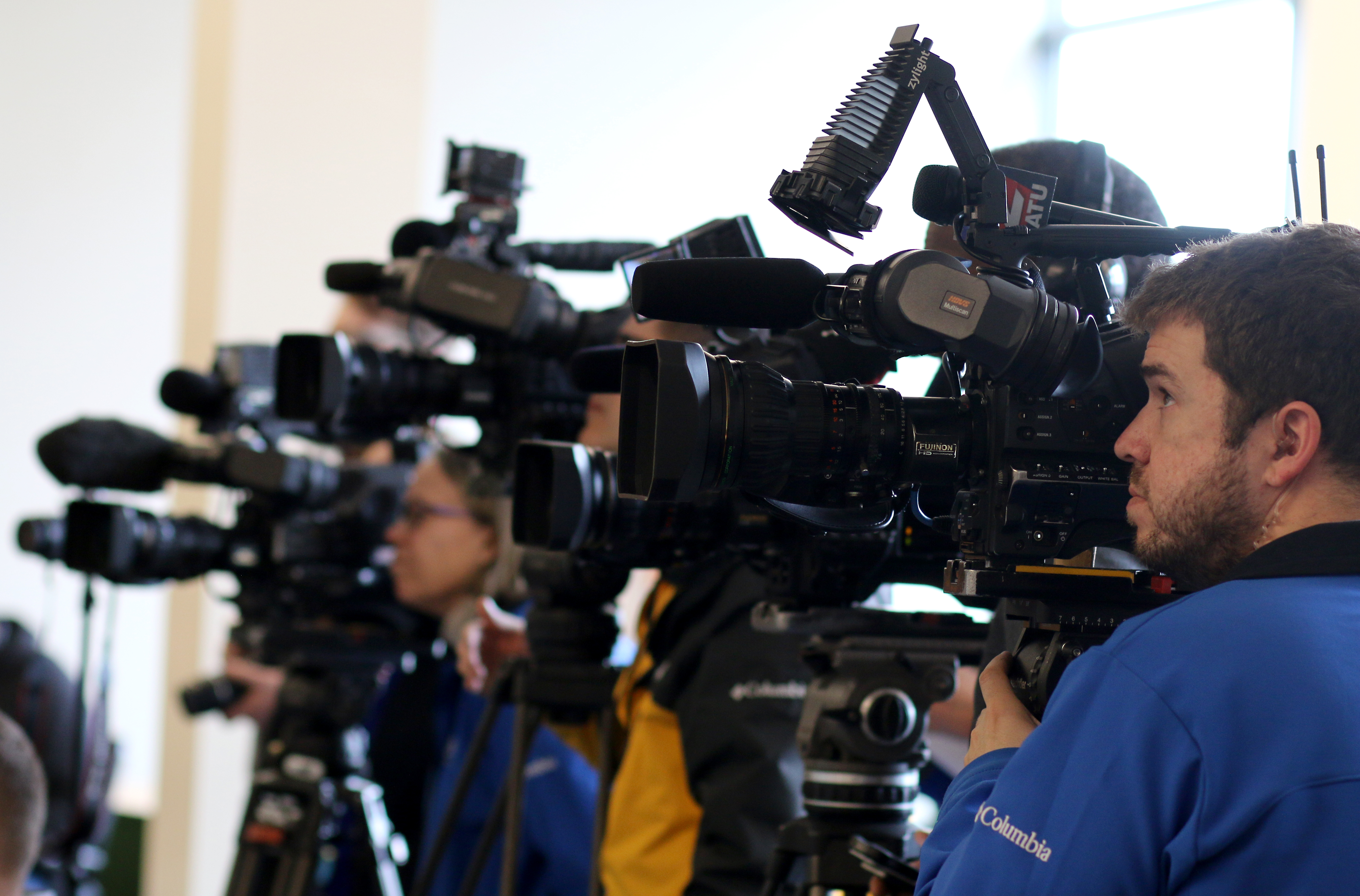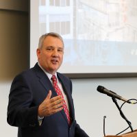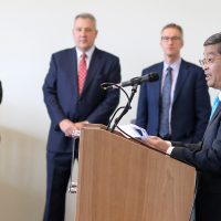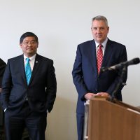 PCC President Mark Mitsui talks to reporters about the impact of the historic collaboration as PSU President Wim Wievel, OHSU President Joseph Robertson and City mayor Ted Wheeler look on.