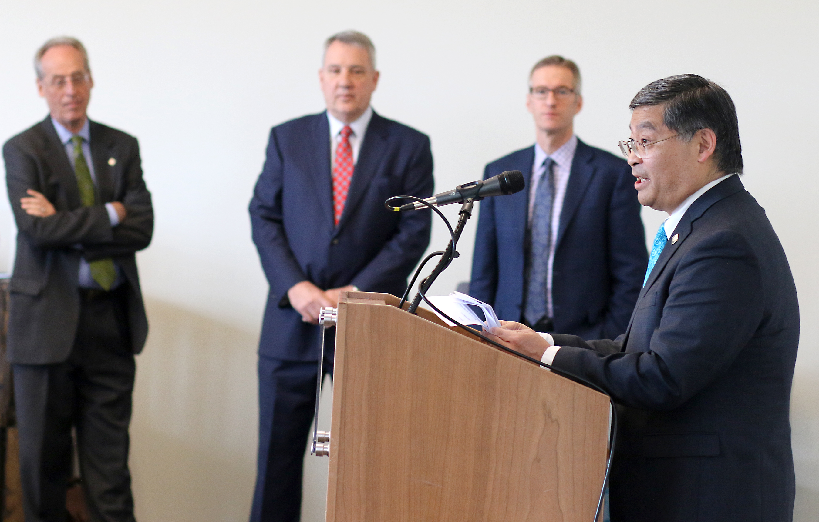 PCC President Mark Mitsui talks to reporters about the impact of the historic collaboration as PSU President Wim Wievel, OHSU President Joseph Robertson and City mayor Ted Wheeler look on.