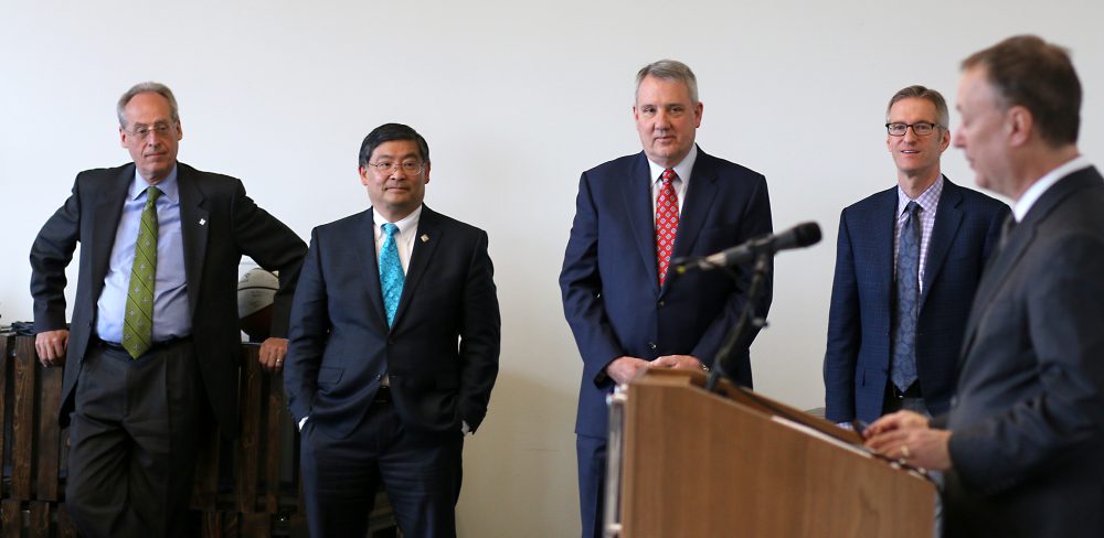PCC President Mark Mitsui talks to reporters about the impact of the historic collaboration as PSU President Wim Wievel, OHSU President Joseph Robertson and City mayor Ted Wheeler look on.