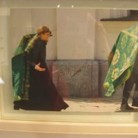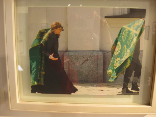 Walter Morales, an instructor in computer science, won second place for two photographs he took during a visit to Ukraine. In one, clerics carry ornately embroidered emerald-green church vestments. The second depicts a sea of battered, radioactive books in a library near the town of Chernobyl.