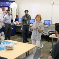 U.S. Rep. Suzanne Bonamici waves at Zippy the Drone with Rock Creek staff and Campus President Sandra Fowler-Hill (left). On the far right is Matthew Altman, Division Dean of Science & Technology at the campus.