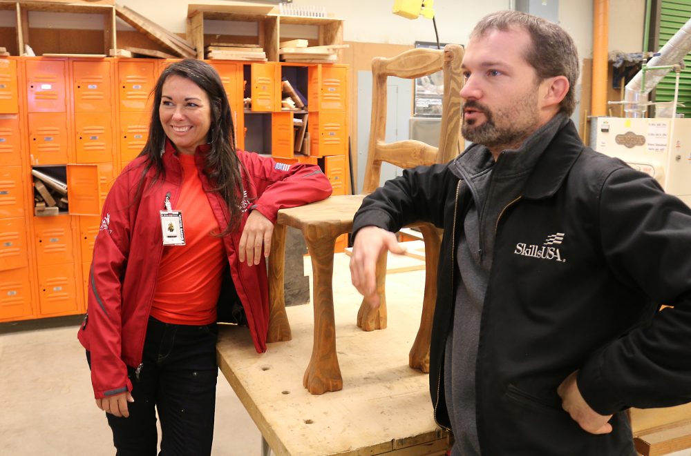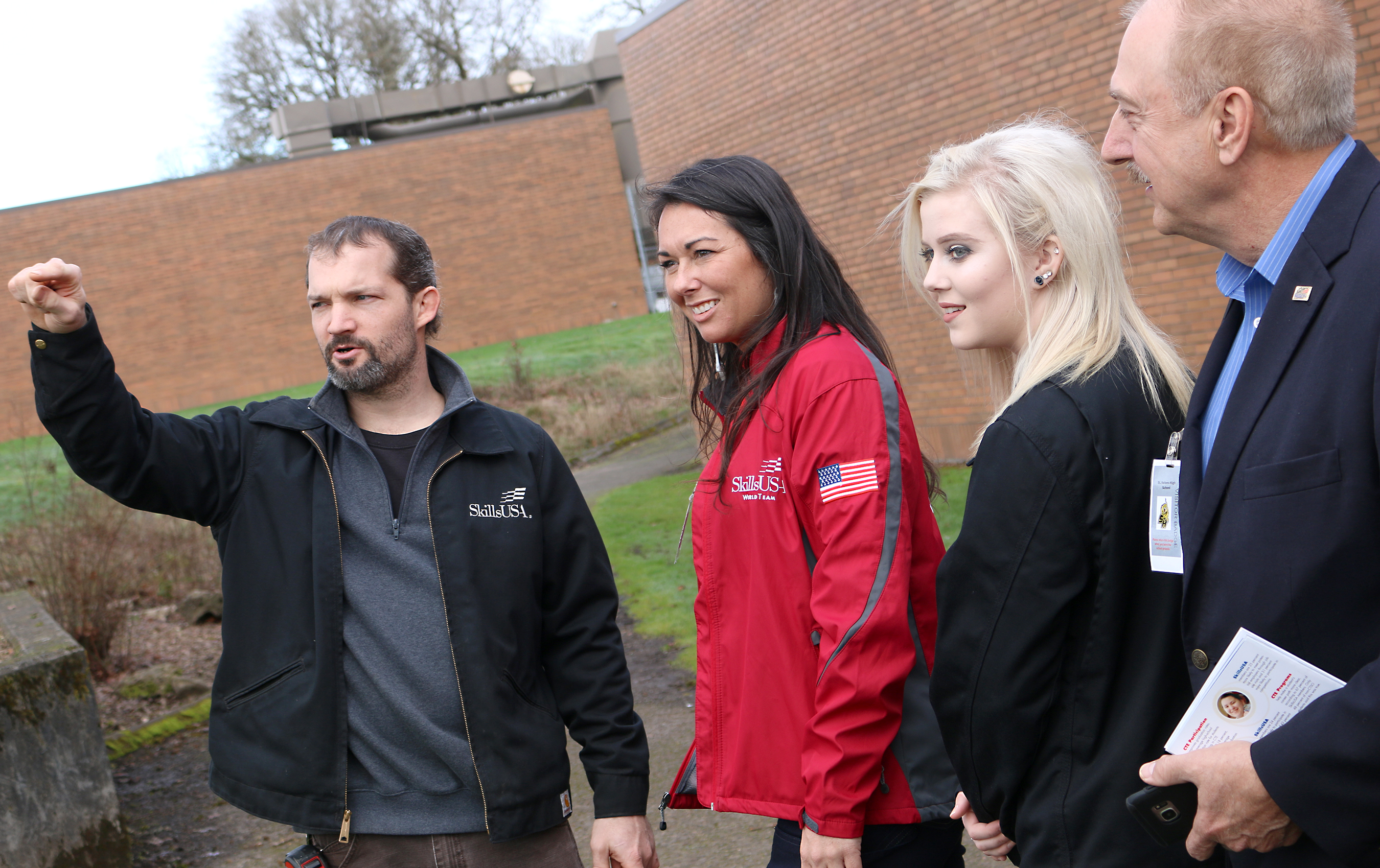 In honor of national SkillsUSA Week and CTE Month (Feb. 4-10), host Kayleen McCabe of DIY Network’s “Rescue Renovation” stopped by St. Helens High School to tour its innovative career and technical education (CTE) programs. After encouraging the students to think about careers in the trades during a special apprenticeship forum in the school’s auditorium, McCabe toured the dual credit CTE programs that St. Helens has with PCC – Automotive Service Technology, Building Construction Technology, Computer Aided Design, Drafting Technology, Hospitality and Tourism, Early Childhood Education, Office Systems, Engineering, Natural Resources and Manufacturing.