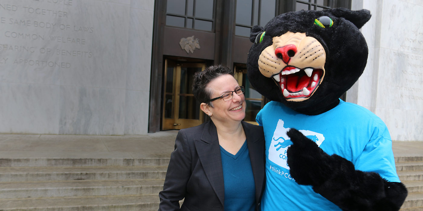 Poppiethe Panther and Lisa Avery in front of the Oregon Capitol